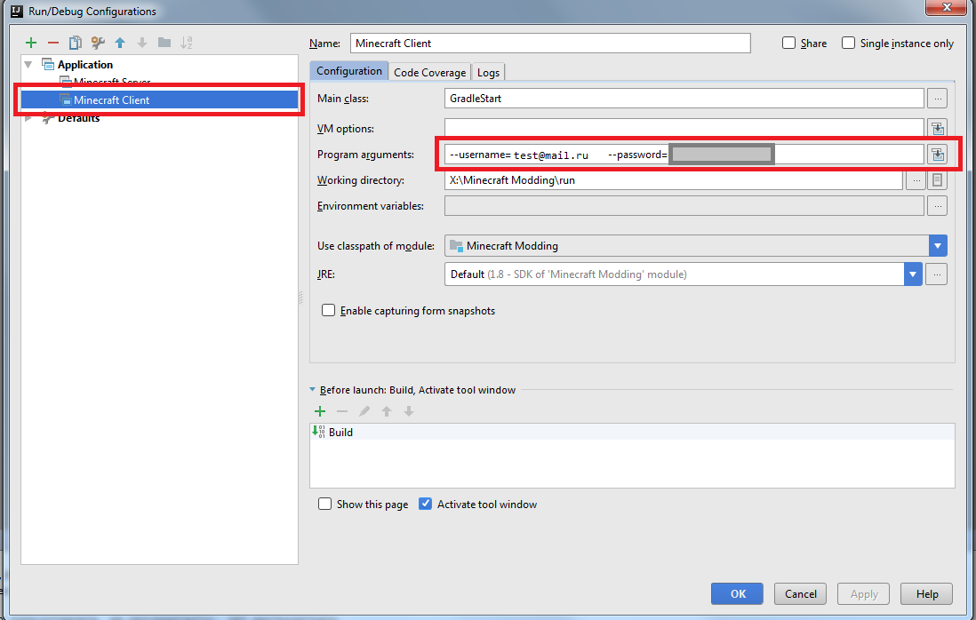 В левой части открывшегося окна выберите пункт "Minecraft Client" и введите в поле "Program arguments" следующую строку: