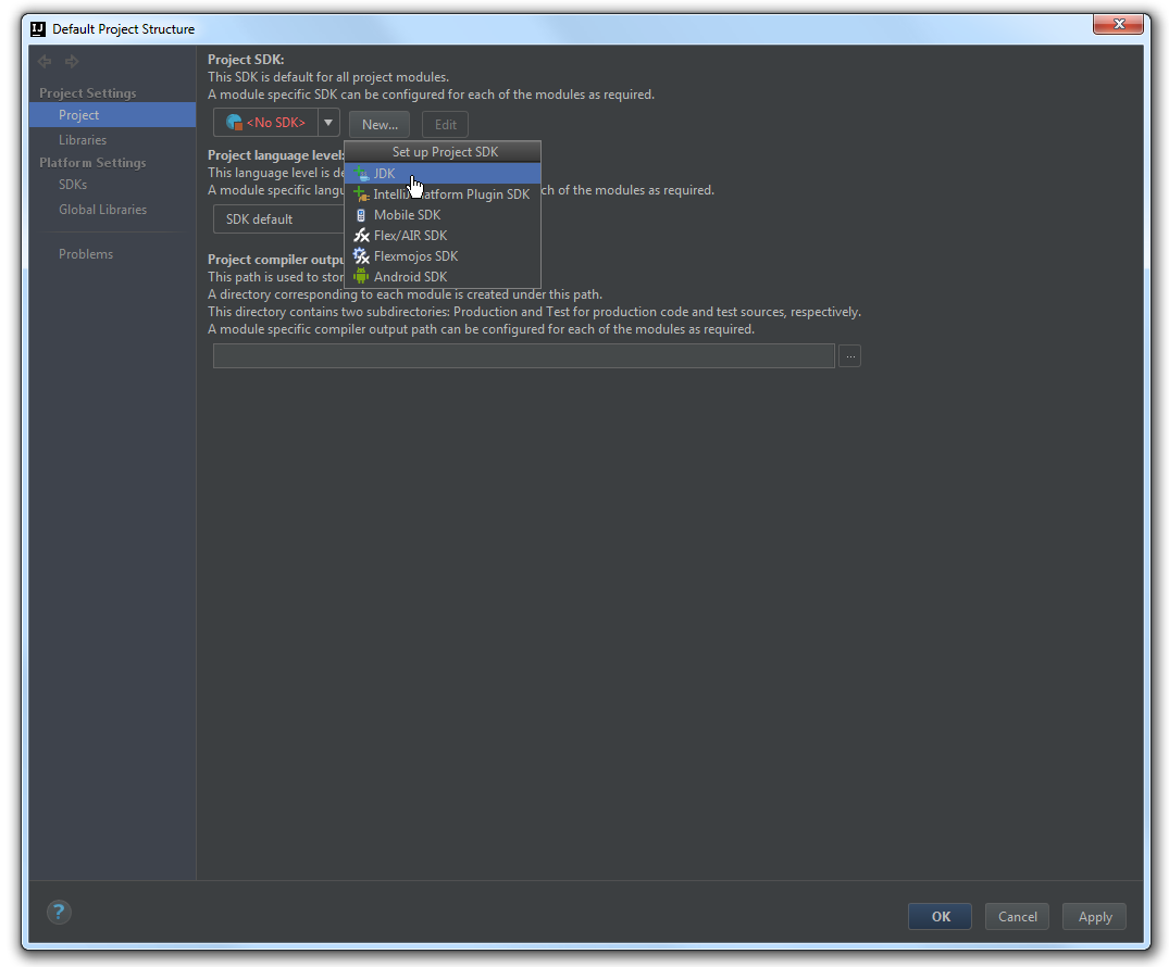В открывшемся окне нажмите на кнопку "New...", которая находится рядом с красной надписью "No SDK" и выберите пункт JDK.