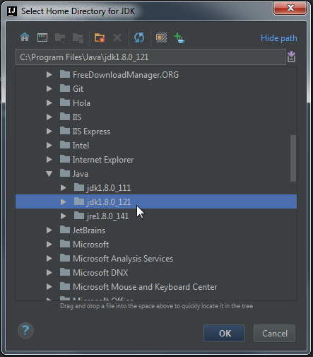 Теперь просто укажите путь к установленной JDK. В моем случае путь следующий C:\Program Files\Java\jdk1.8.0_121.