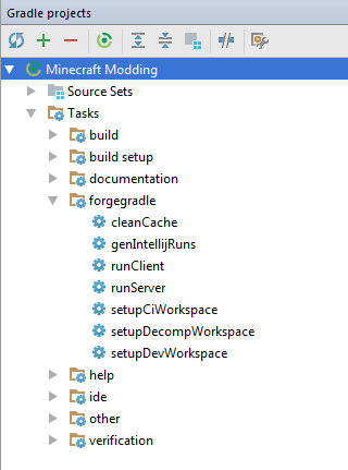 Выполните таск setupDecompWorkspace из группы forgegradle. После его завершения выполните таск genIntellijRuns из