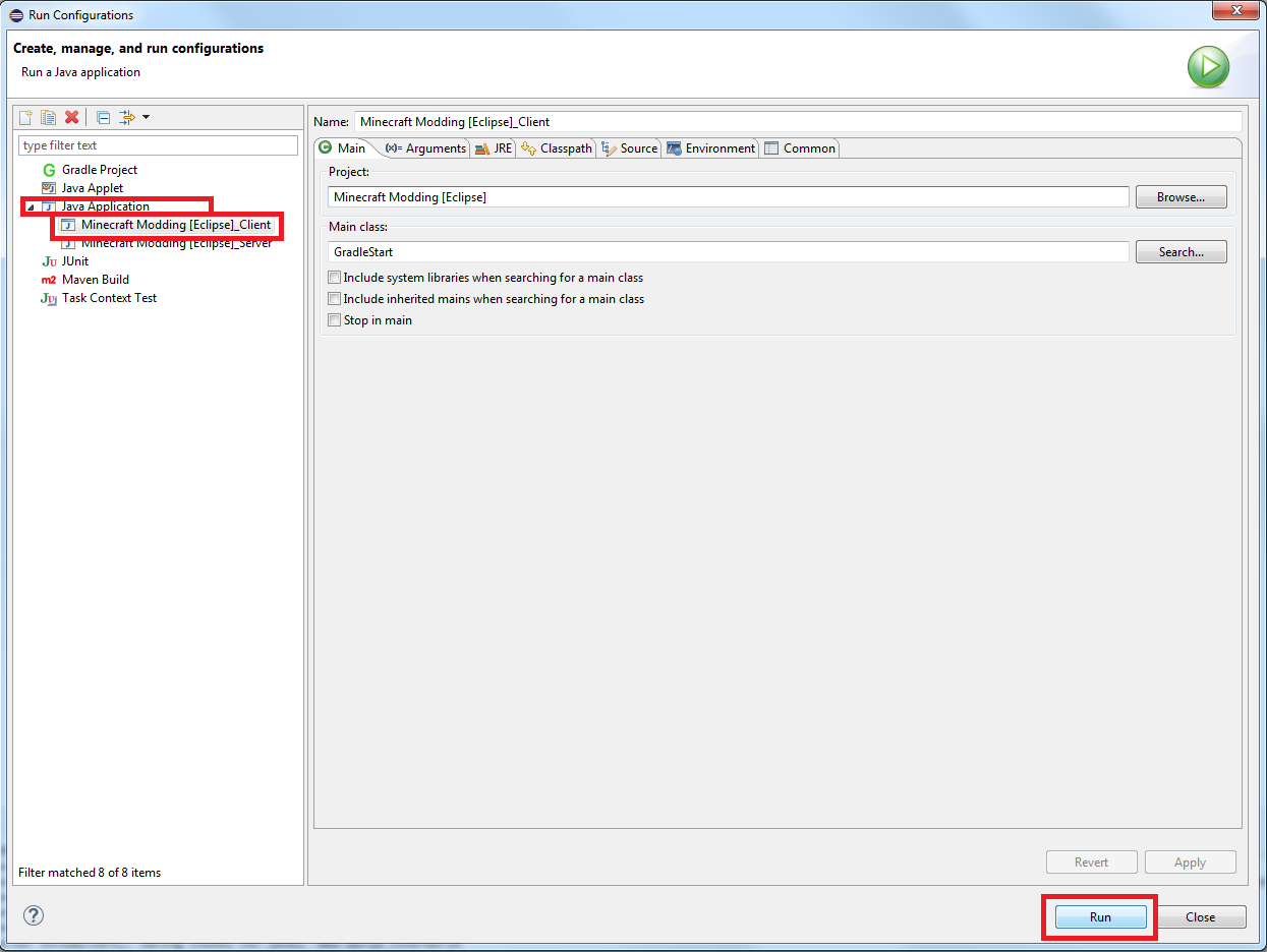 Для тестового запуска в верхней части экрана откройте меню "Run" и выберите пункт "Run configurations". В появившемся окне слева откройте вкладку "Java Application" и выберите клиент или сервер. Затем, нажмите на кнопку "Run".